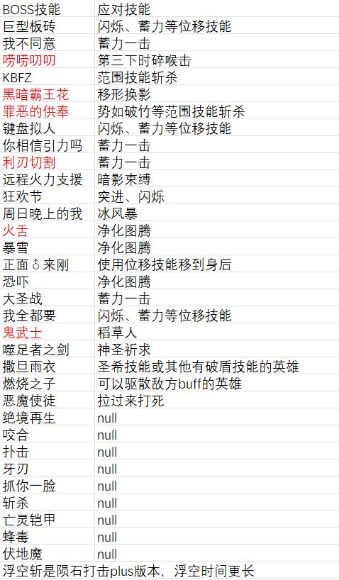 |技能应对表(如有错误或者补漏请群内联系)