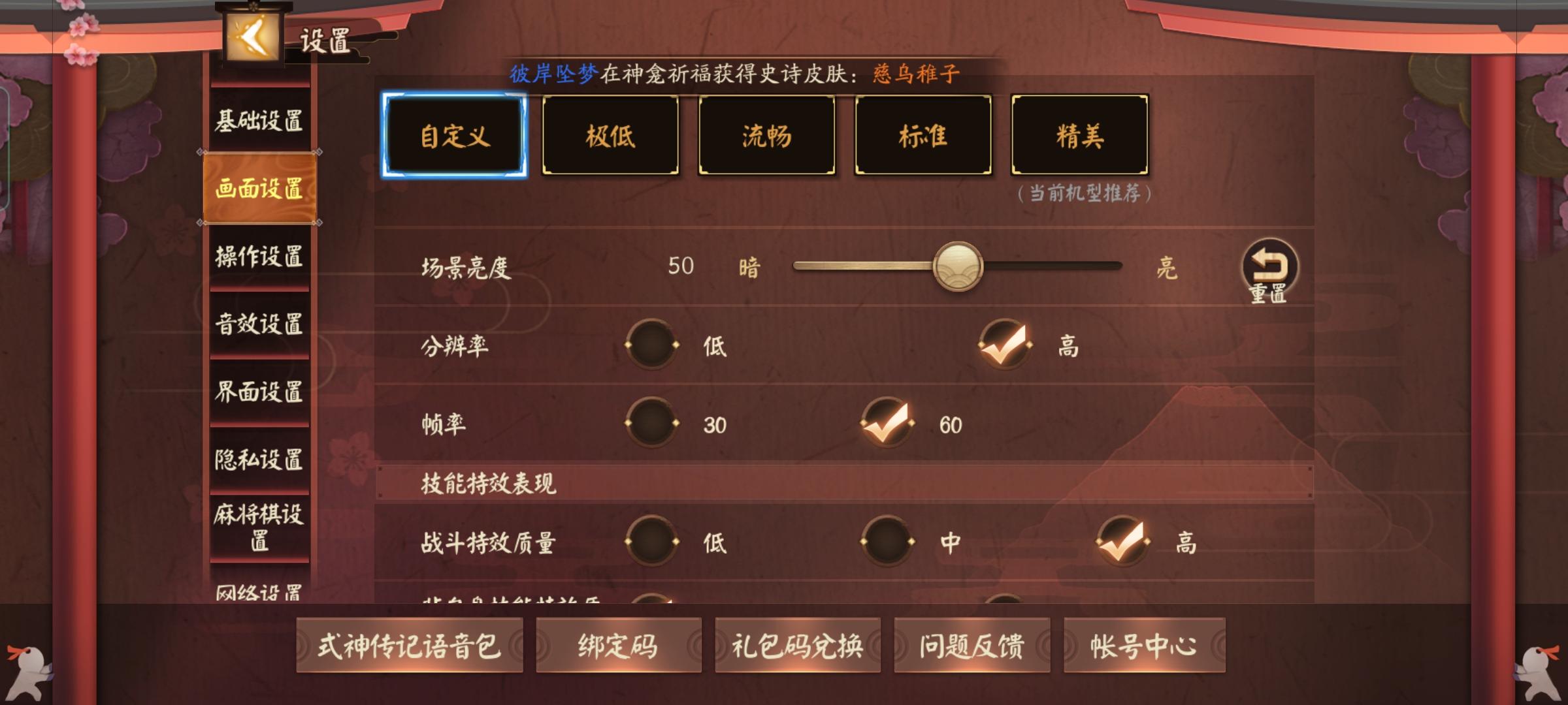 场景配置全调最低,其他特效和分辨率之类的调最高,这样帧数基本都能维持在55~61,打团也不会低于50