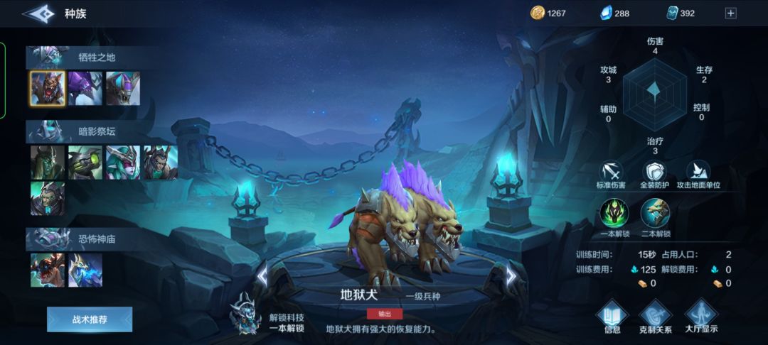 地狱犬:前期作用巨大,单刷矿点或是干扰对手刷野都不错,利用脱战回复的特性可以多次与对方英雄换血迫使对方回撤。后期可以替高级部队吃一些单体控制技能。