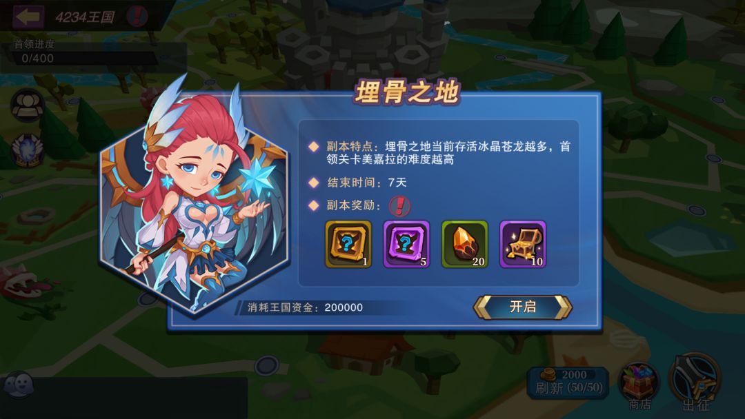 达到4级的王国每周可以消耗王国资金开启埋骨之地副本。埋骨之地难度较高,开启后王国资金不会退还,建议新区的团长在王国所有成员练度都足够后再进行开启。