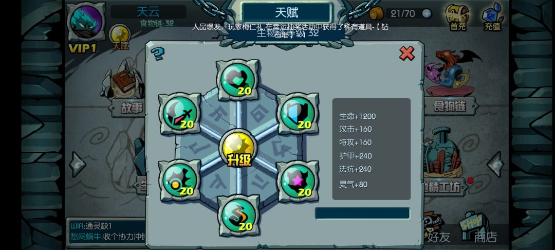 天赋点前期都点到20就差不多,往后升很浪费金币也能加一点点战力