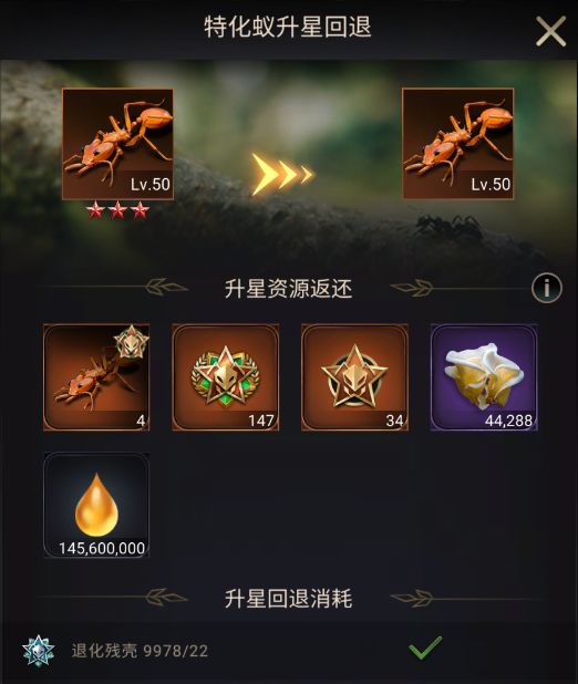 已升星的特化蚁,可在特化蚁故事界面,点击升星回退按钮进行特化蚁升星回退,每次升星回退都需要消耗退化残壳。