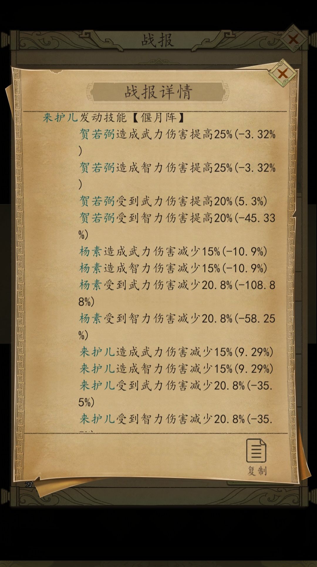 除了杨素来护儿本身属性优秀外,众多的减伤更是让隋盾极其抗打。神威护隋+暂避锋芒+权倾朝野+偃月阵=超过100%的减伤。如图: