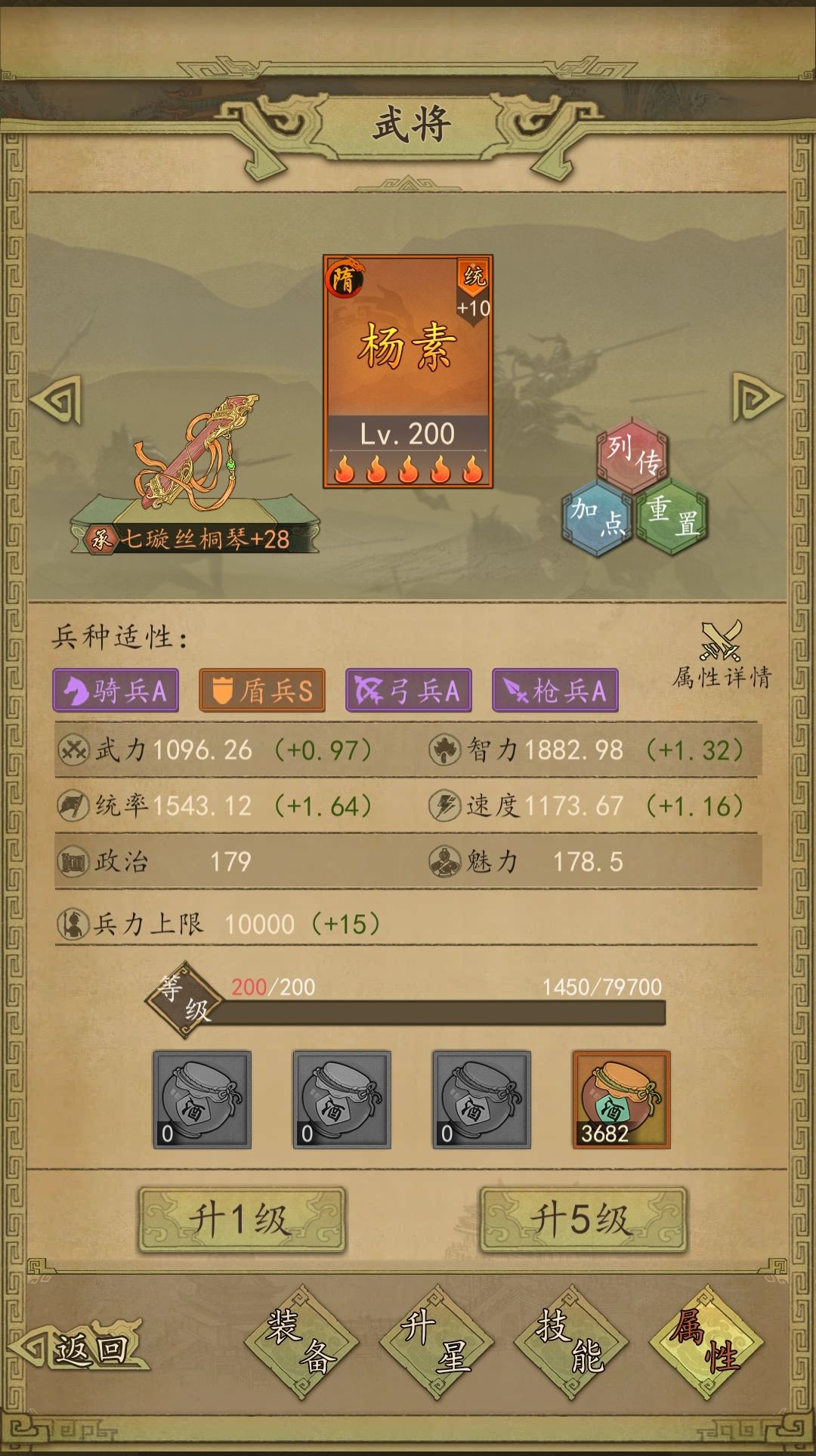 再就是杨素了,杨素本身应该是主智力副统率,但是不少人玩成了主统率副智力。为什么要主智力呢?因为杨素对武力攻击真的是一点都不怕,前面已经提到,杨素本身可以吃到超过100%的武力减伤,本身成长加宝石已经够了,不需要再加点统率。而权倾朝野和暂避锋芒都吃智力加成。此外,杨素的养成类似李世民但又不完全相同,出色的坦度让急智谩敌等嘲讽技能在杨素身上相对于李世民更加适配。