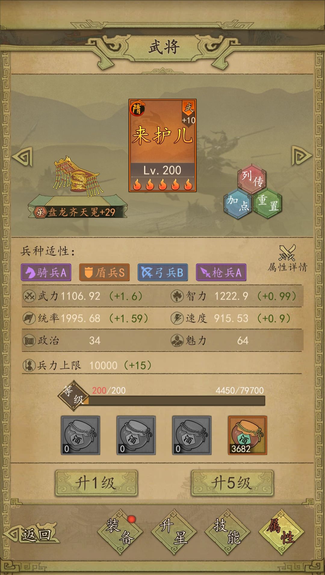 一次打几百点伤害甚至几十点伤害实在也没什么意思。所以来护儿根本不需要叠武力,甚至堆点智力提高点坦度都来得实在些。也没有必要给来护儿装不畏强敌了,装了也就几千伤害,实在不够看。