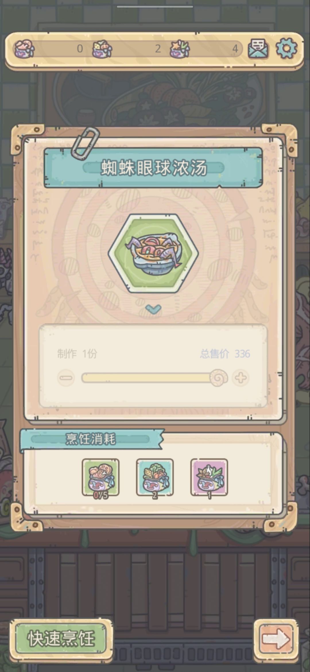 再比如这个绿色品质的“蜘蛛眼球浓汤”,一共需要5个(绿色)材料+2个(蓝色)材料+1个(紫色)材料。一共8个材料,现在这个品质可以出售得到336个美食币,也就是平均每个(不论品质)材料相当于可以获得42美食币,明显比20是赚的。