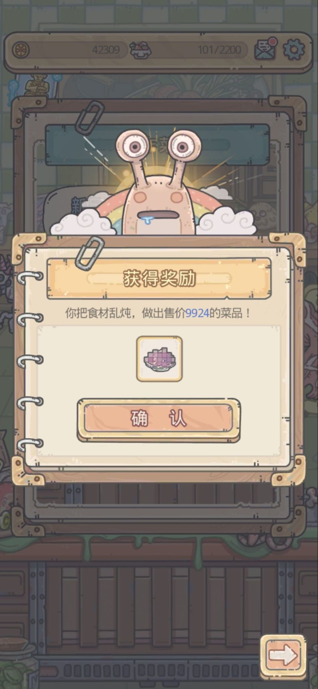 再来看乱炖,乱炖消耗至少100材料,消耗100材料大约会得到在两千到一万二左右价值范围浮动的奇怪的食物。如图,