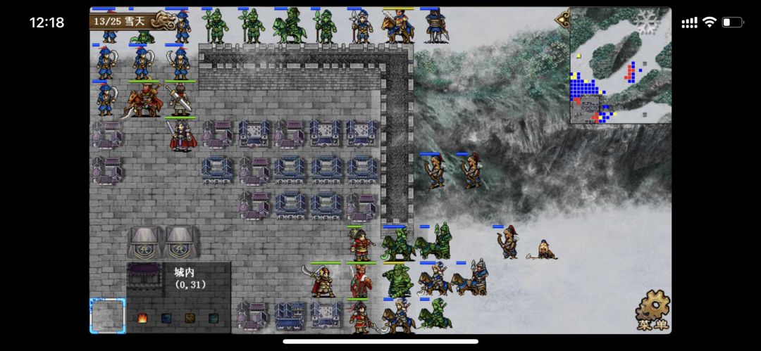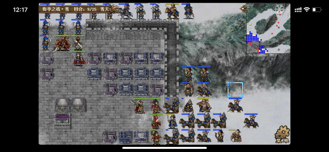 1~5回合见视频,城内堵住两个城门,放过海贼隔山打牛,6回合把孙权的蓝抽光限制群体补血,后续无压力;援军8回合可以消灭敌方法师团,10回合赶路到雪地隐藏的村庄,小夏、徐晃日字型卡位挡住援军,衰气后一回合强杀甘宁,后期三路北城门汇合,杀到诸葛处完成全灭,贴图略过。