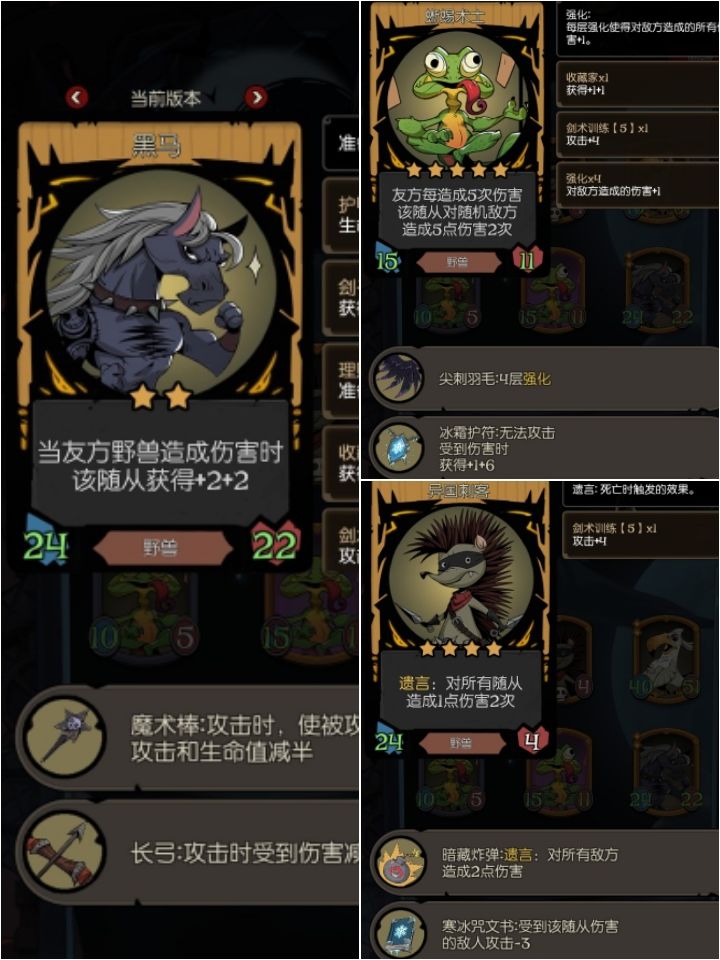 后期有刺猬和蜥蜴必拿,这是机关枪的组件核心,有金合金,虽然伤害低,但加的伤害次数足够使黑马变的超模,武器的话,刺猬和蜥蜴拿强化,黑马拿魔法棒+长弓,再加点疯狂属性就更完美,护盾不用拿,拿了也没用。(注:有了上面这组合还被boss打败,不是伤害不够,而是你的站位不同,机关枪打的很随机,多试着变动几次位置就能把对面嘎了。)