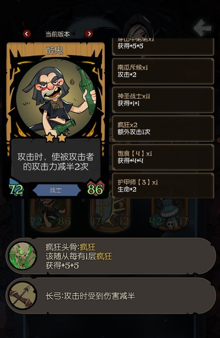 思路:就是养酒鬼,前期拿到酒鬼后。入场随从加的各种buff一股脑甩他身上就行,中期要在商店拿到盾和加疯狂的武器和属性奖励,后期要一些减属性的武器才能抵抗最后几关。(注:这个流派我主页有全程视频攻略,至于为什么不把酒鬼放在前排,当然是因为有利于苟活呀!一般怪只会先攻击前排的怪,我们在前排放几个无法攻击的墙来扛伤害,醉鬼阴在后面先给他减攻,岂不美滋滋。另外后期装备来的好,基本可以无伤过。)