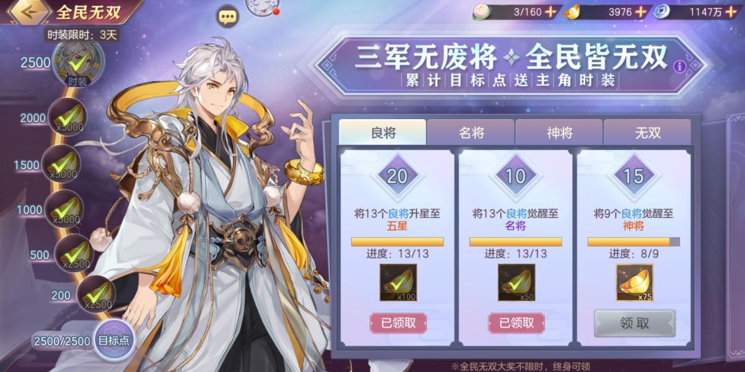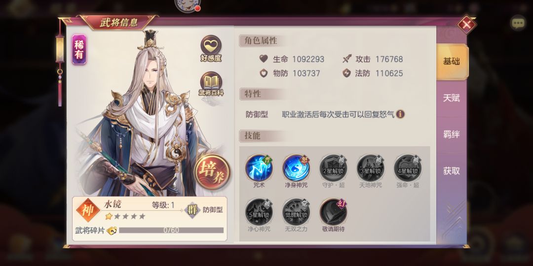 然后就是紫将觉醒顺序(实在来不及才这么做,石头一周只能买五个要留给主将):甄姬——吕玲绮——步练师——袁绍,如果运气好水镜星级高的可以先觉醒盾将,一个一火有30点基本可以稳(过两天有免费重生,石头不够可以重生个王元姬蔡文姬换石头拿时装)