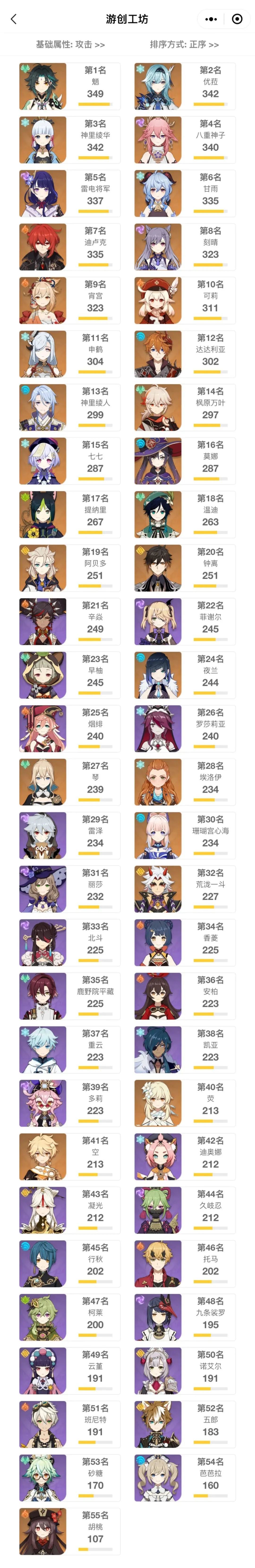 下面是工坊整理的3.0版本全角色基础属性排行。全角色攻击力(无武器)