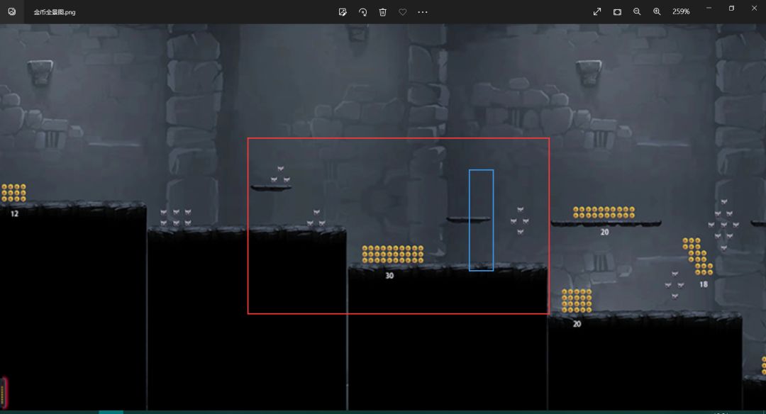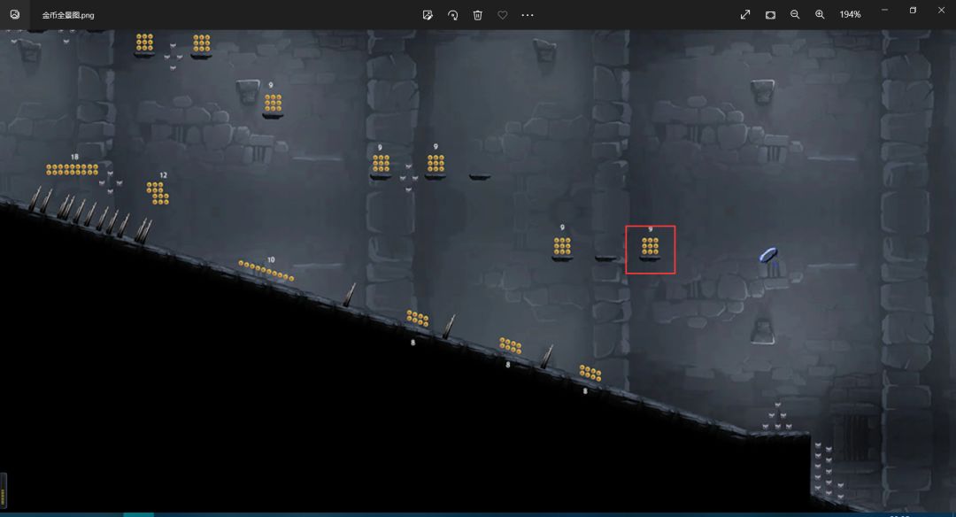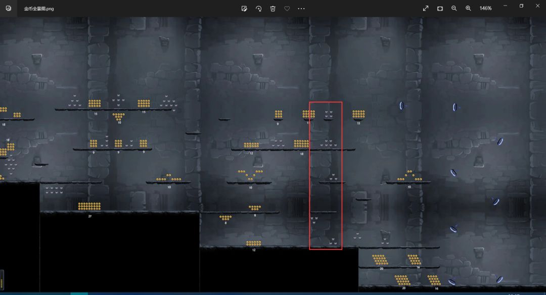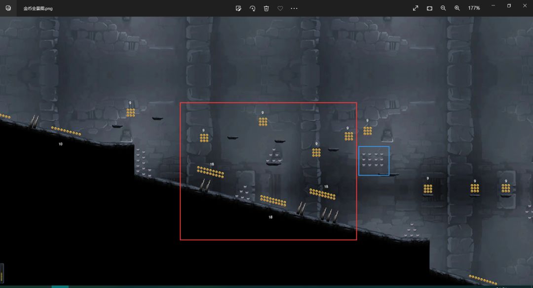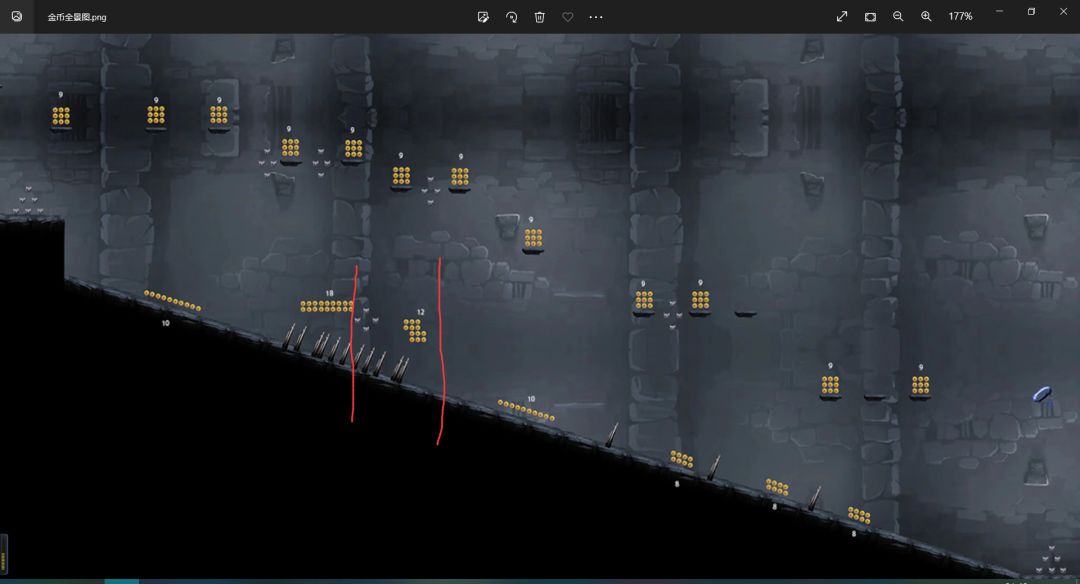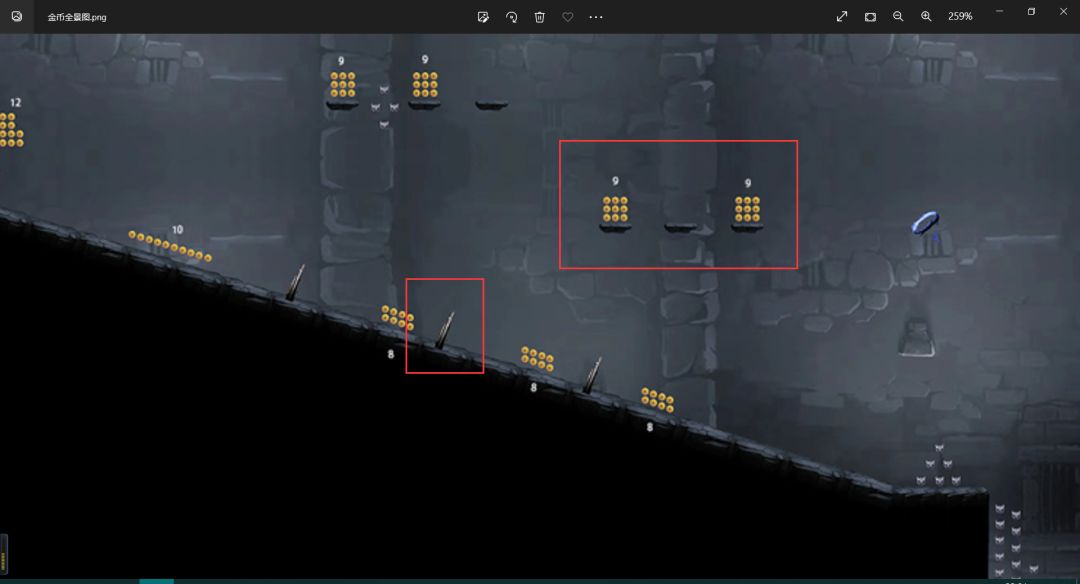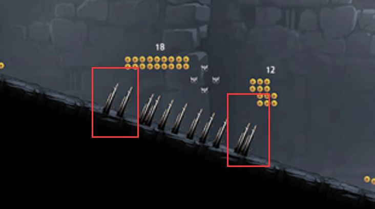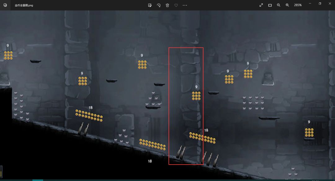 这里小椒死掉之后是一个非常关键的点,大家看视频里会发现,红色框内的九宫格金令剑是吸不到的,需要一个三段跳上板去吃这9个,但是大家练的时候会发现,经常出现小黑跳出屏幕了然后又掉下来,上不去板子的问题。这就涉及到游戏的优化问题,接力的时候有的人会卡一下,导致跳的太晚了,就容易出现上不去板的情况。