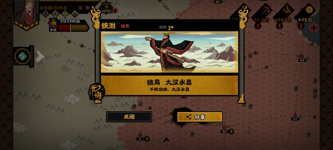 如果想要达成大汉永昌,则需要再打一场,如果对自己实力有信心的玩家(5年内匈奴战力不会那么高)可以222平均分配
