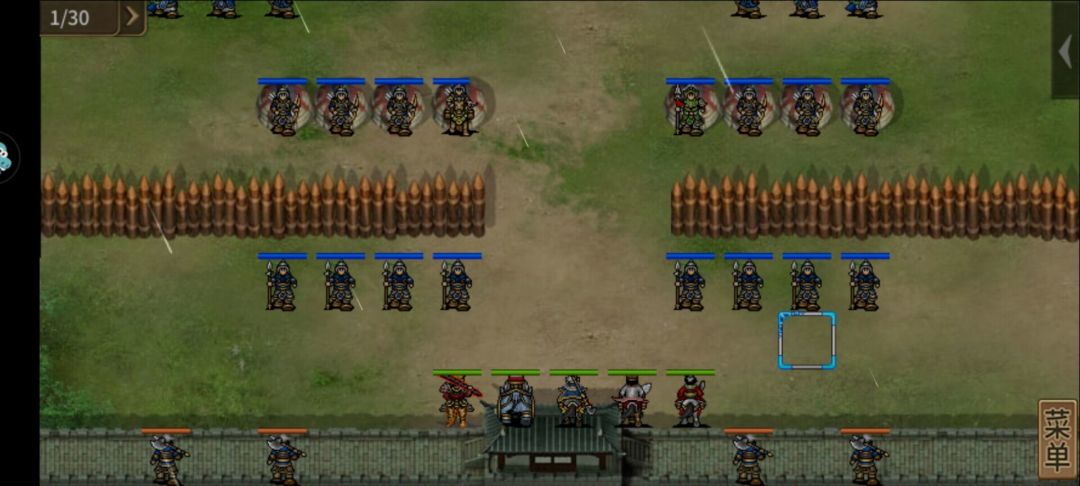 本关一共30回合,一般20回合就够了,所以时间充足!开局我方不进营,敌人不会主动出击的,所以先加状态,加移动。我的选择是前2回合原地调整,没必要打小兵,打死也会复活,也没必要打到残血。徐庶第一回合寒门,郭嘉五石散;第二回合徐庶举荐。