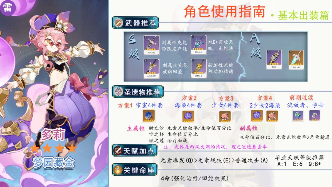 首先是图文流的速读指南,多莉的圣遗物、武器选择,以及天赋加点方案等如下图所示