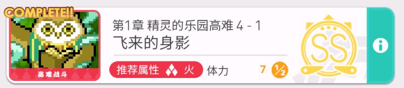 高难关卡仅推荐刷第一章4-1,会掉落一个2(6)星风系角色猫头鹰,最佳辅助
