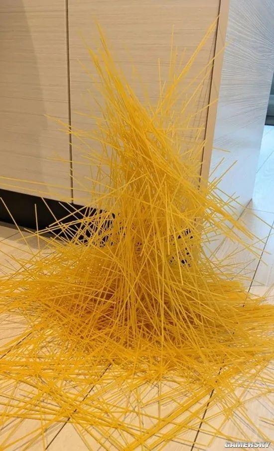 把意面撒地上了,结果居然撒成了一个前卫艺术品?