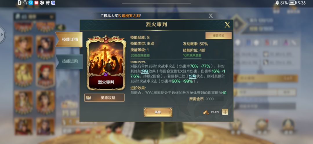 岳飞施加灼烧效果时,还能有50%的概率使目标禁疗,而玛丽一世增加4%的主动技能发动概率,施加灼烧状态的概率依然没有岳飞的高。