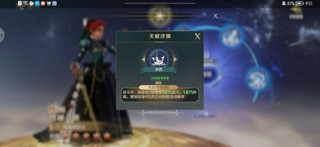 战斗中增加一定的智力和防御属性,增加自身4%的主动技能发动概率。