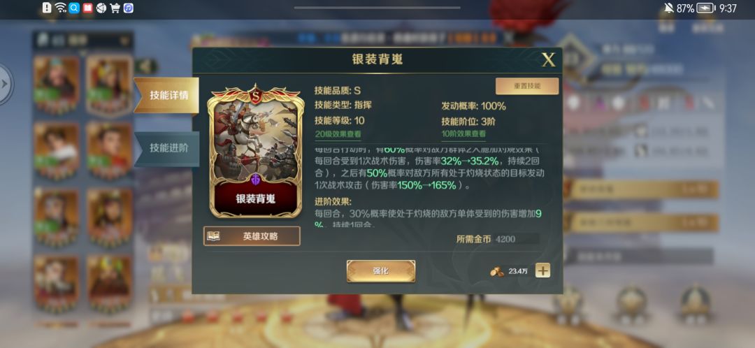 指挥型技能,有60%的机率对敌方2人施加灼烧效果,之后有50%机率对处于灼烧状态的目标发起一次战术攻击,进阶后,每回合30%的机率使处于灼烧的敌人单体受到的伤害增加。