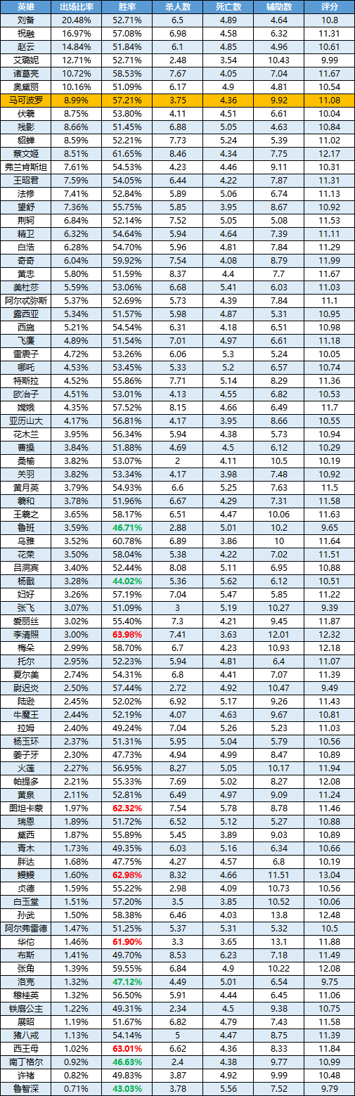 注:此榜单按出场率由高到低排序,标红为胜率前5的英雄,标绿为胜率排名倒数的英雄