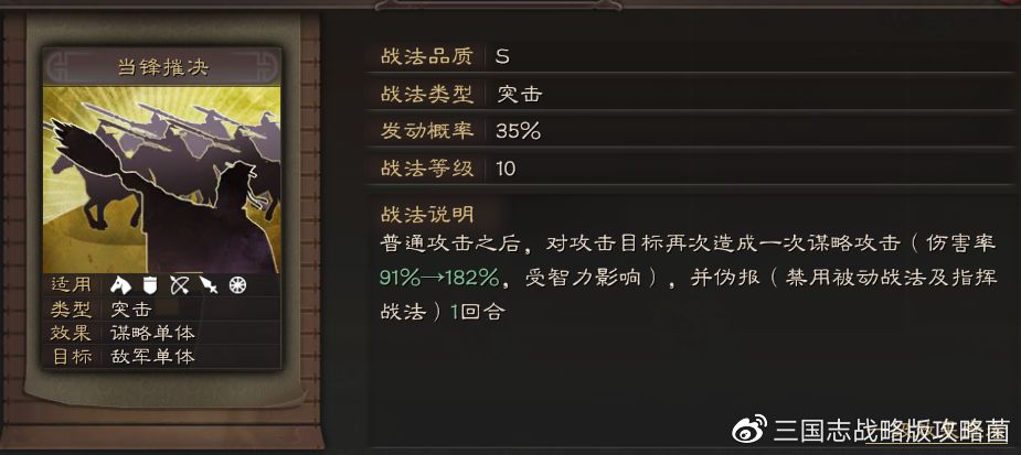(2)满级基础值为182%,受智力影响。在所有谋略型突击战法中伤害最高。可即便如此,这个数值也与【兵无常势】差了近60%。常见学习武将有,太史慈、郭嘉、诸葛亮,还有部分兵书里有奇正相生的智力武将。