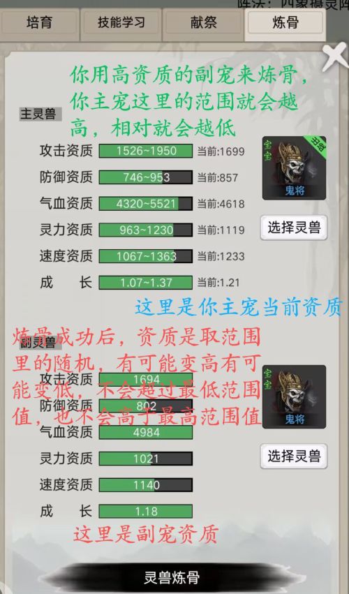 如下图,准备好主宠及副宠后就开始练骨啦,除了好资质外,这里也是存在很大的运气成份哦。
