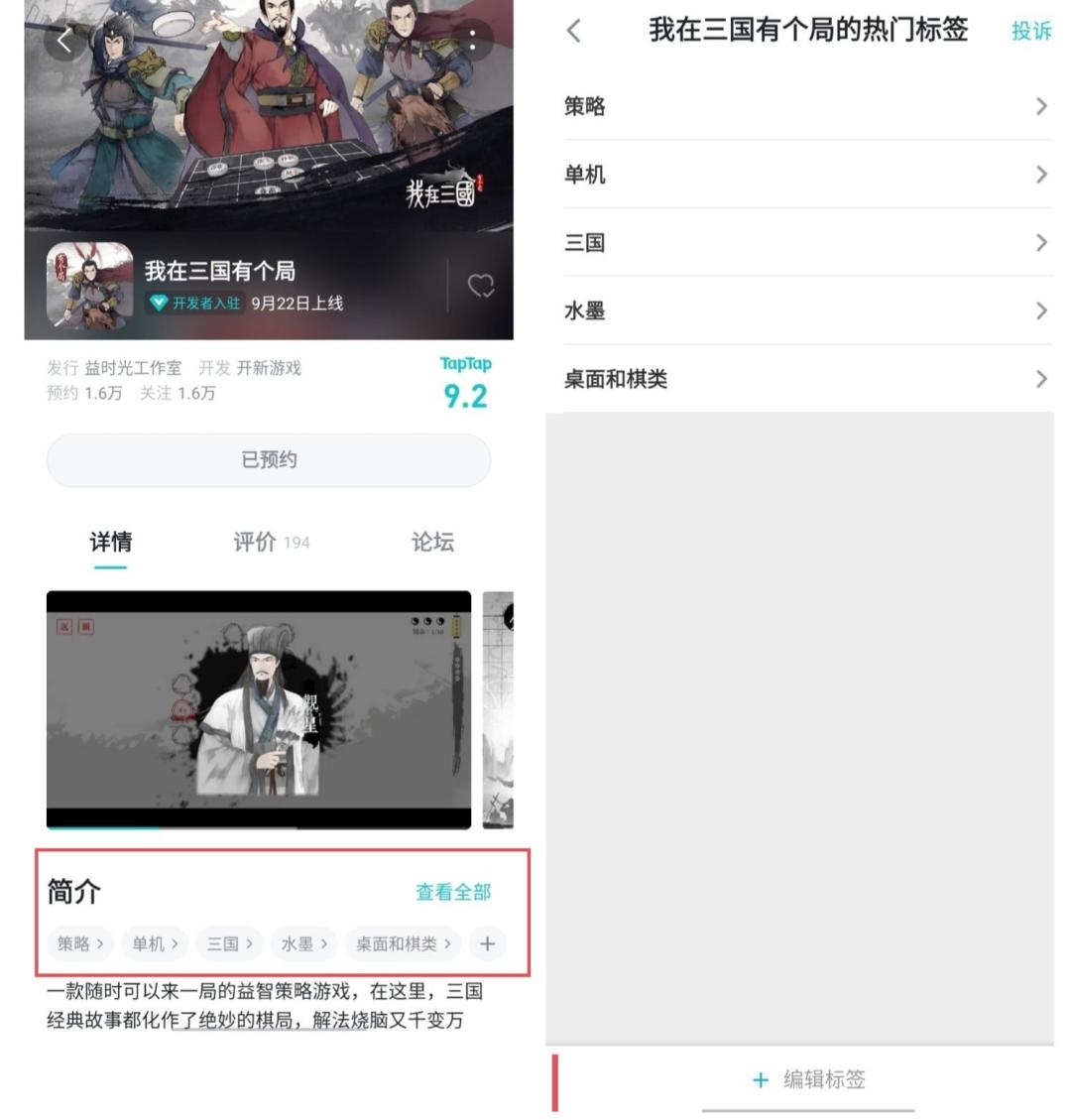 1.进入《我在三国有个局》详情页找到【简介】下面的【标签】及【+号】。