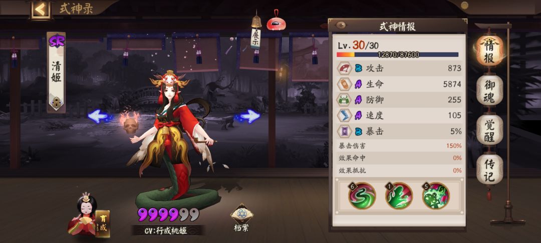 用于PVE的清姬一定要升满技能,其实我不太想推荐清姬的,但看了评论区想了一下,还是决定补上。PVE里清姬的减防和毒不是永续的,算作debuff,而不是像蝎女的毒针和帝释天的金莲一样算作增伤增益,因此绝大多数BOSS都不吃清姬的毒。PVP清姬111就行,主要穿控制御魂当作控制使用,但是105速属实不够看,血量也不高,要么御魂速度够好(带控制御魂的话,要堆效果,因此速度估计很难上去),要么上双拉。秘闻的一些本清姬能带上控制御魂打打减益和控制之类的,除此之外PVE很难再找到有什么用了。前期能用,后期则是完全比不上蝎女。