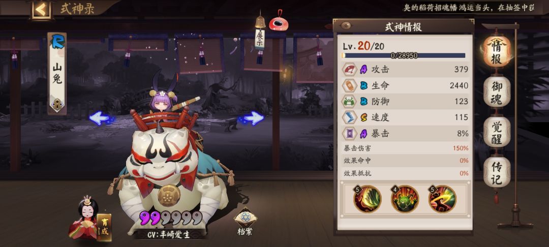 前期必练的拉条式神,天生115速在拉条式神里只能说是垫底,但人家好获取啊,优点和座敷一样,山兔相较于其他拉条式神而言还有一个优点就是满技能的山兔拉条只消耗2火,同拉条的SP面/面灵气/镰鼬都是3火。而且山兔只需要把2技能升满就行了,最低只需要4只山兔就能用了,满级2技能有30%拉条和20%增伤,对行动条末尾式神增伤还能增加至40%。总之,前期很好用,后期打魂土C用狂骨且速度不够的情况下,山兔也是必上的。注意,山兔二技能的20%增伤与晴明的星20%增伤相冲突,只会生效一个,两者同时发动只会刷新持续时间。