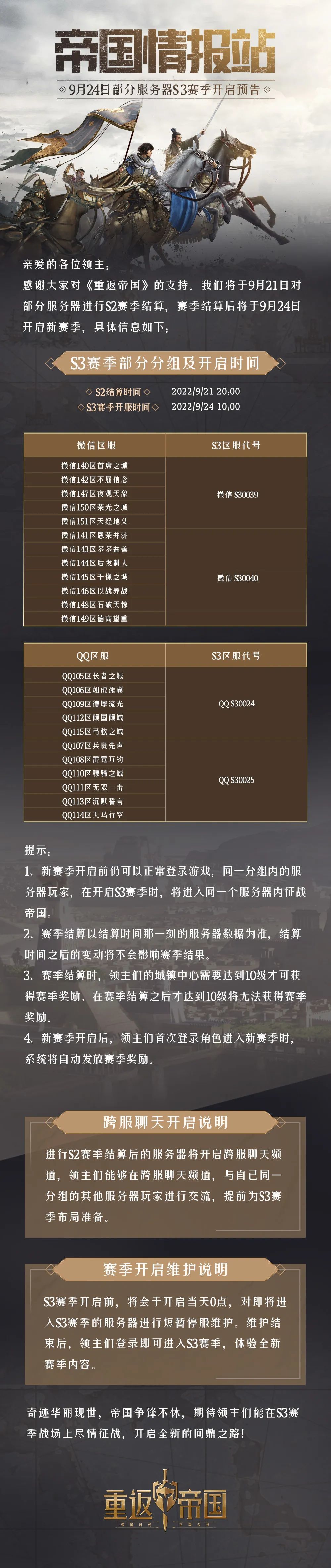 9月24日部分服务器S3赛季开启预告