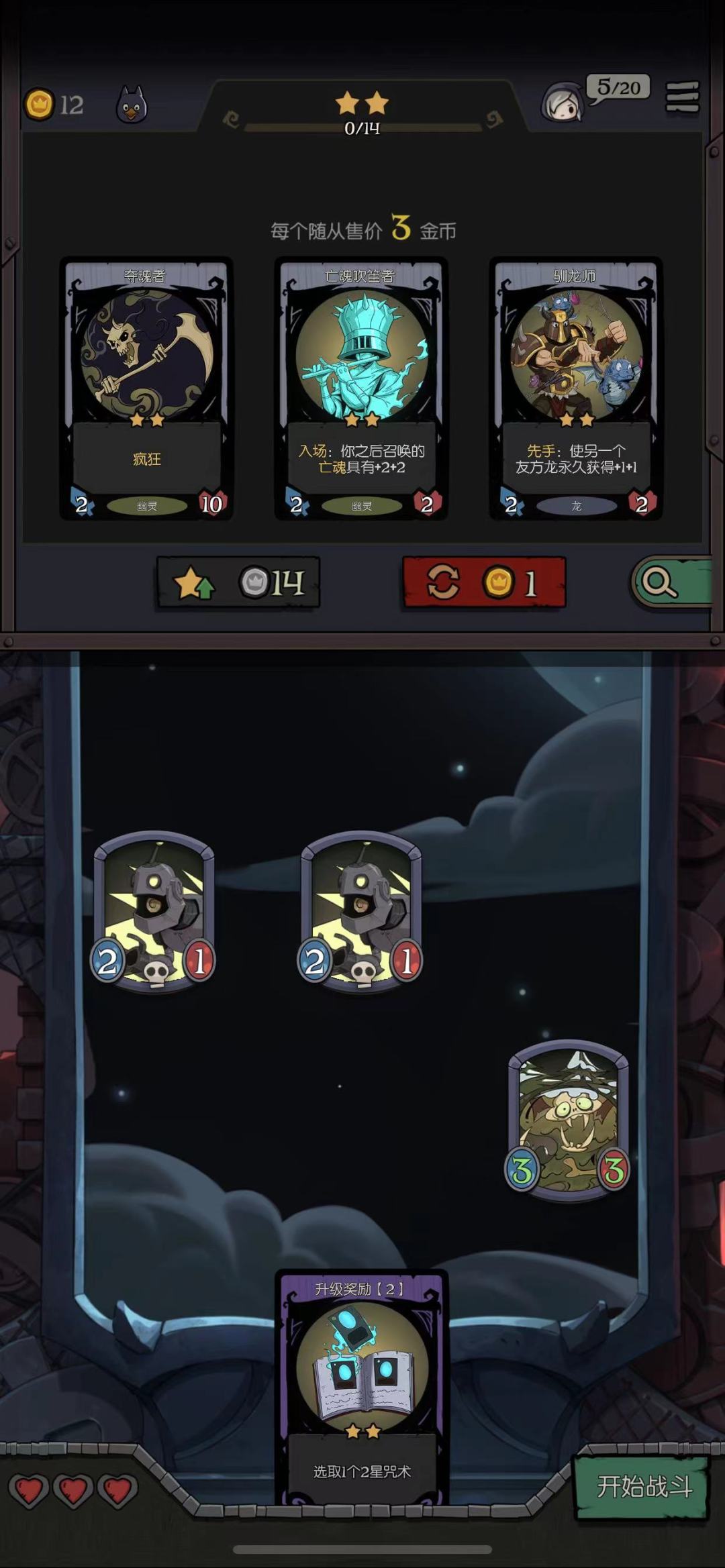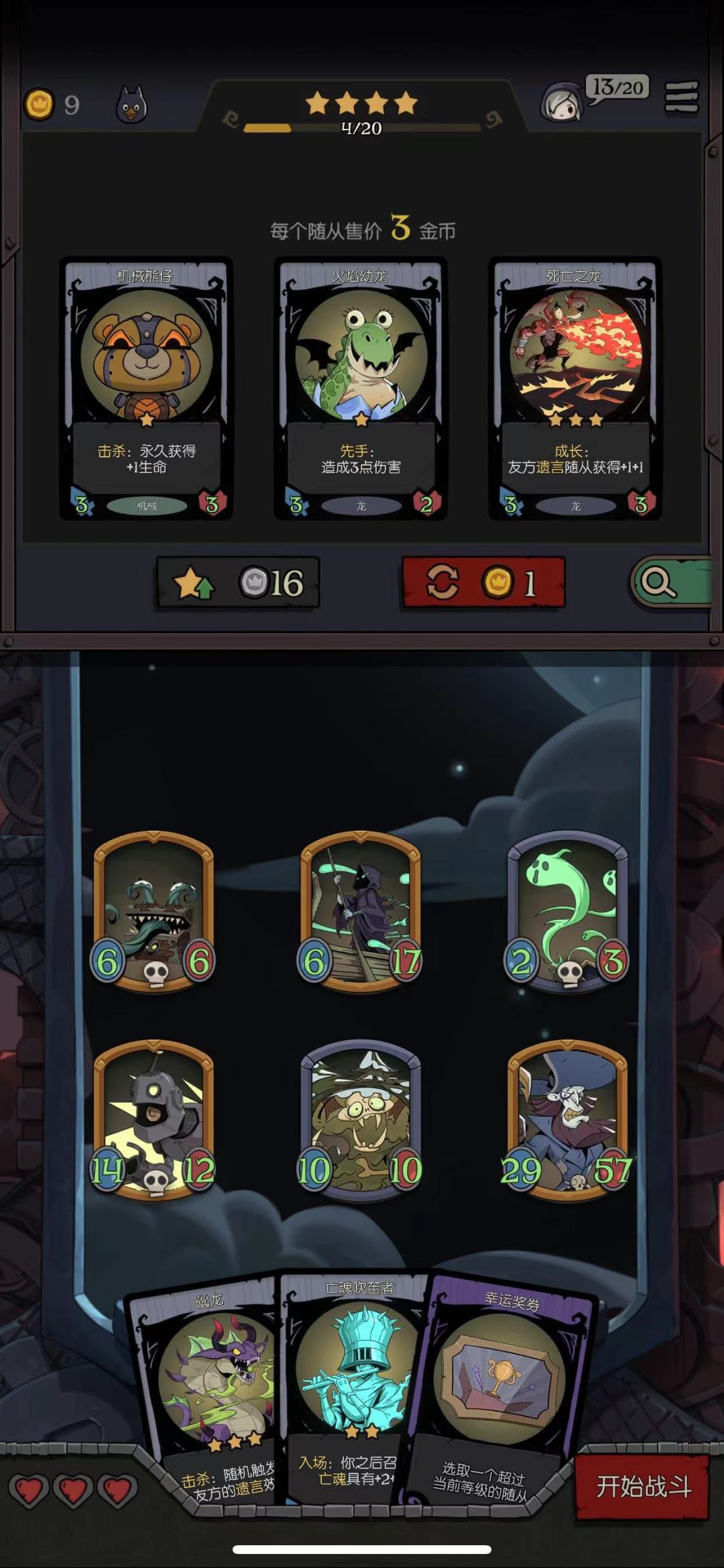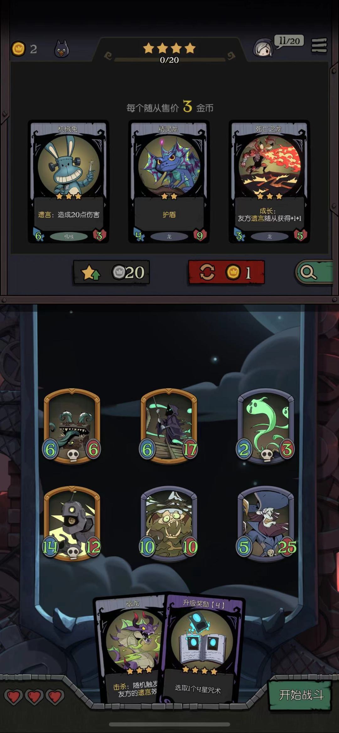 第五回合:这时候你已经升到2级了,升级奖券可以选获得2点经验>加4攻击>加4生命>其他,毕竟钱是最重要的,后期数值已经不挣钱了。