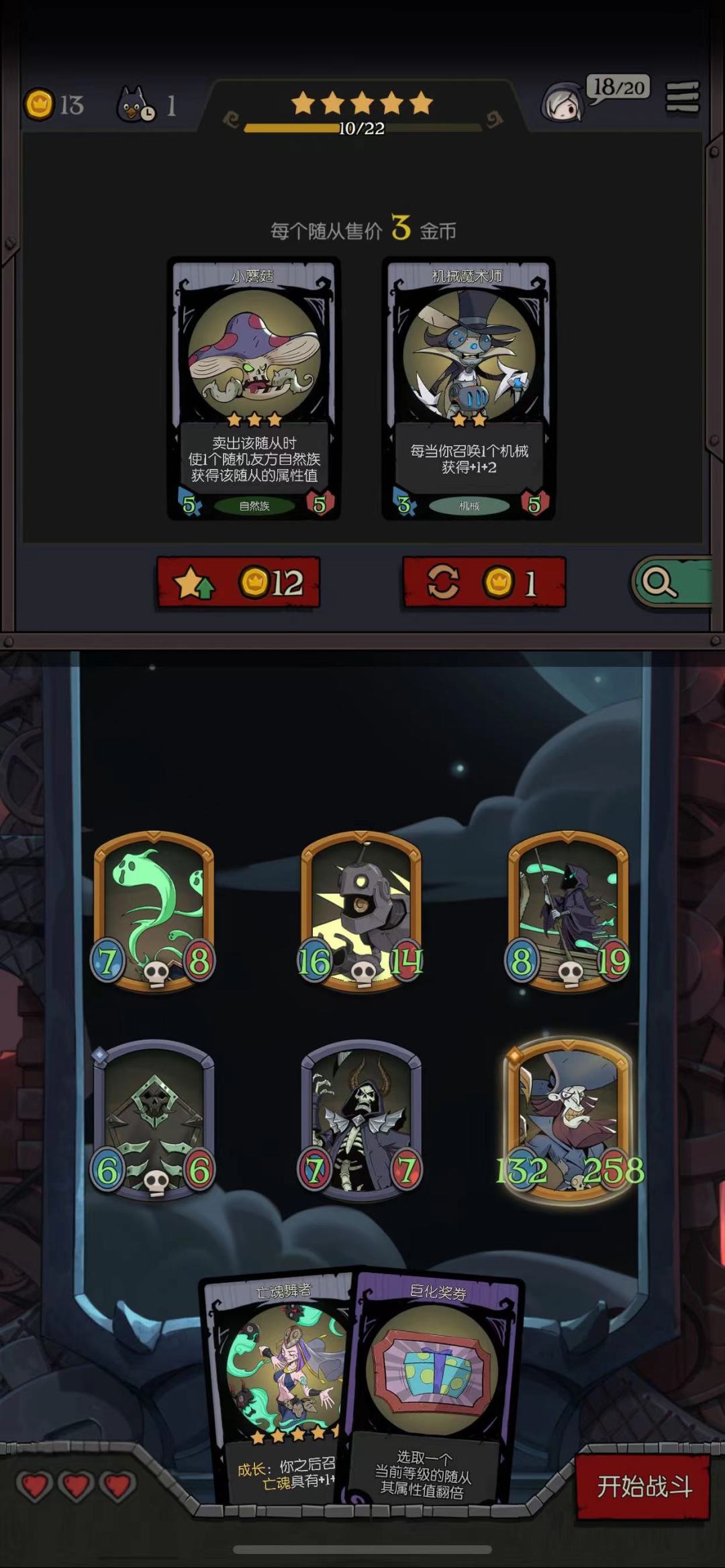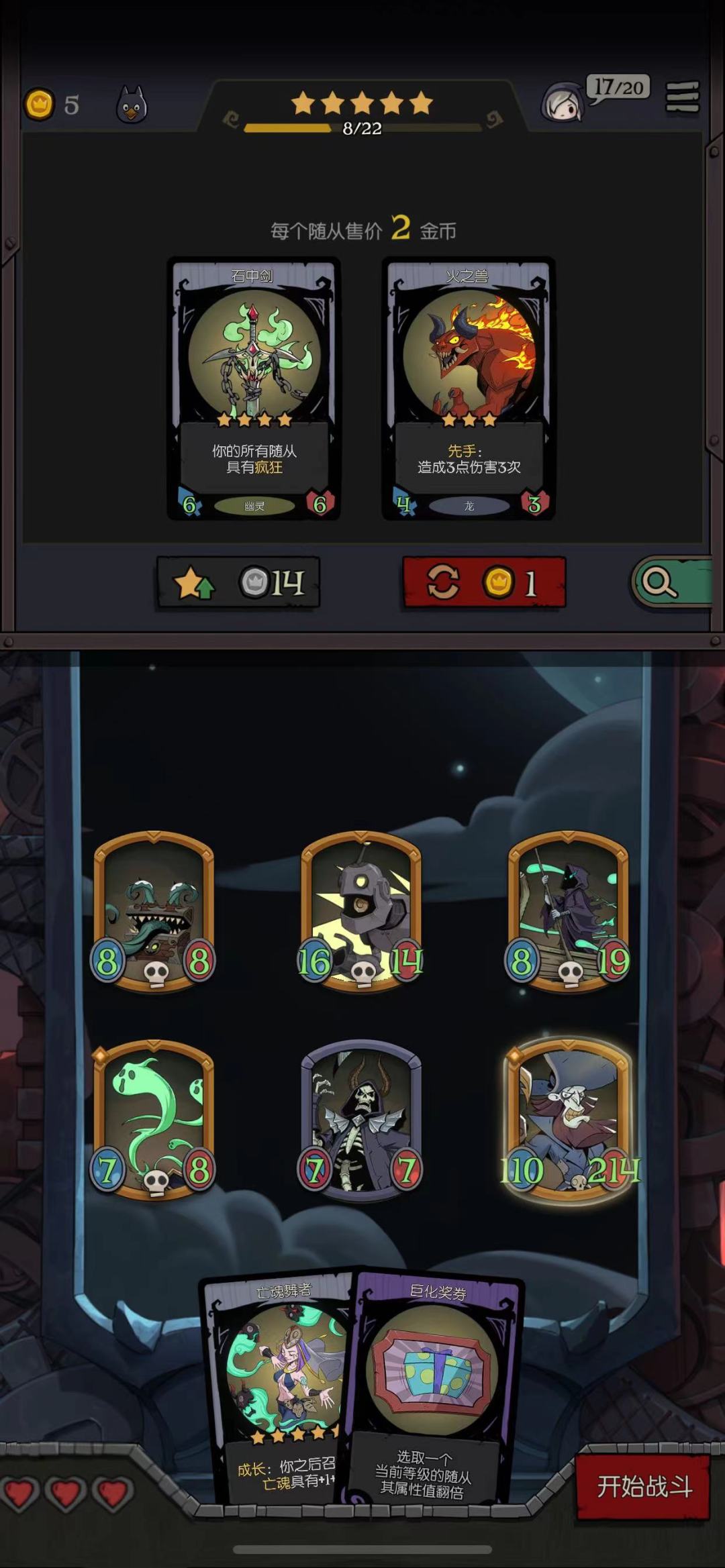 第五回合有一个商店,有+1+1就选这个,没有就选攻击力加倍,再没有就生命加倍。如果是+1+1,可以适当花钱刷新一下,找渡魂者、亡魂吹笛者、小树精和冥界使者,找到几个算几个,进入下一关。