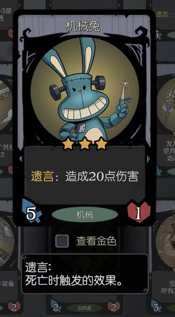 机械兔真的在前期挺猛的,遗言是20伤害,足够灭对方一个了。卡图了可以拿一张机械兔,保证你能撑好几关。