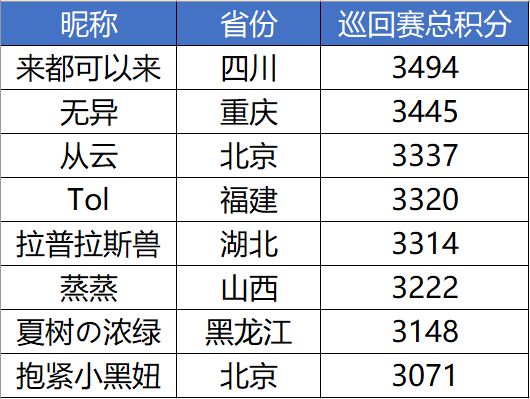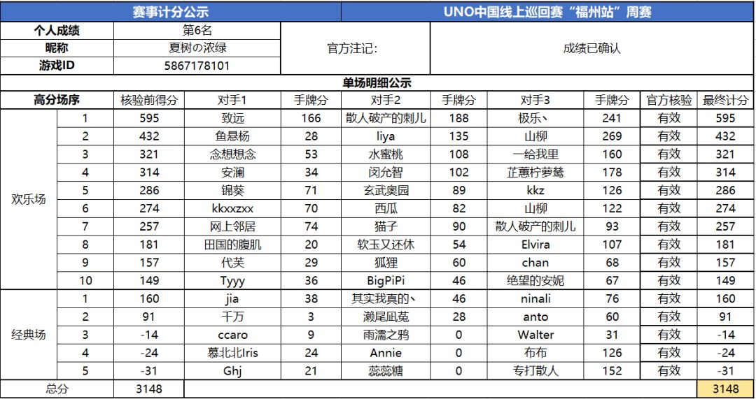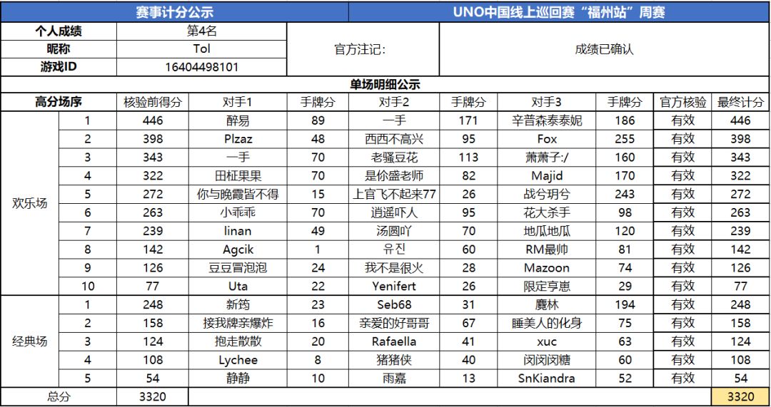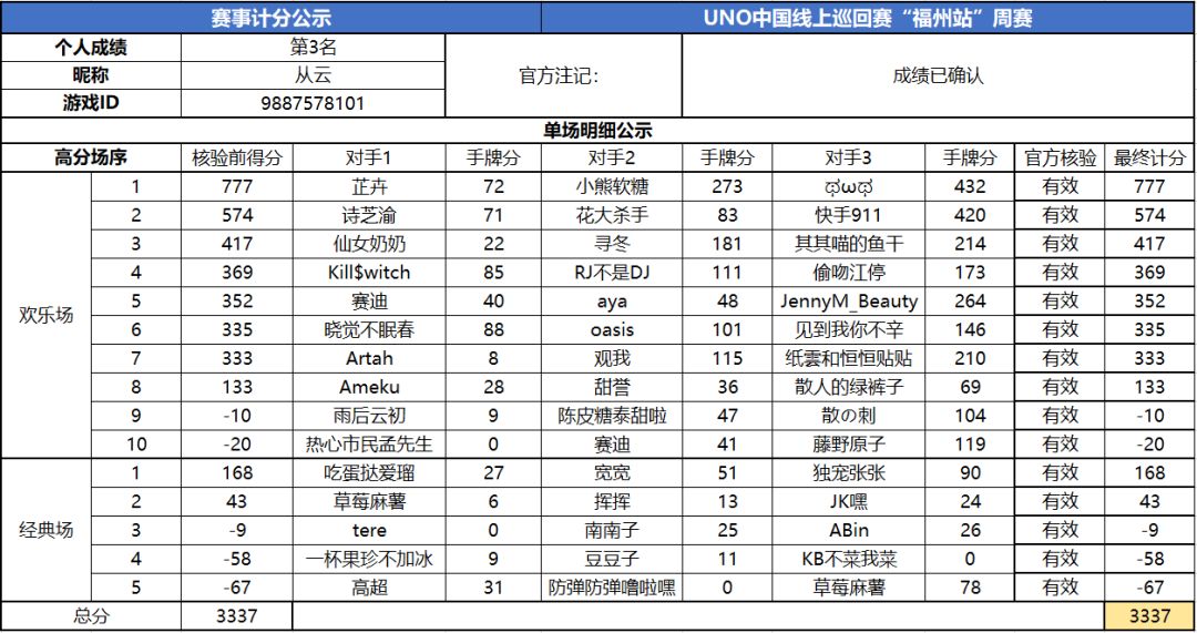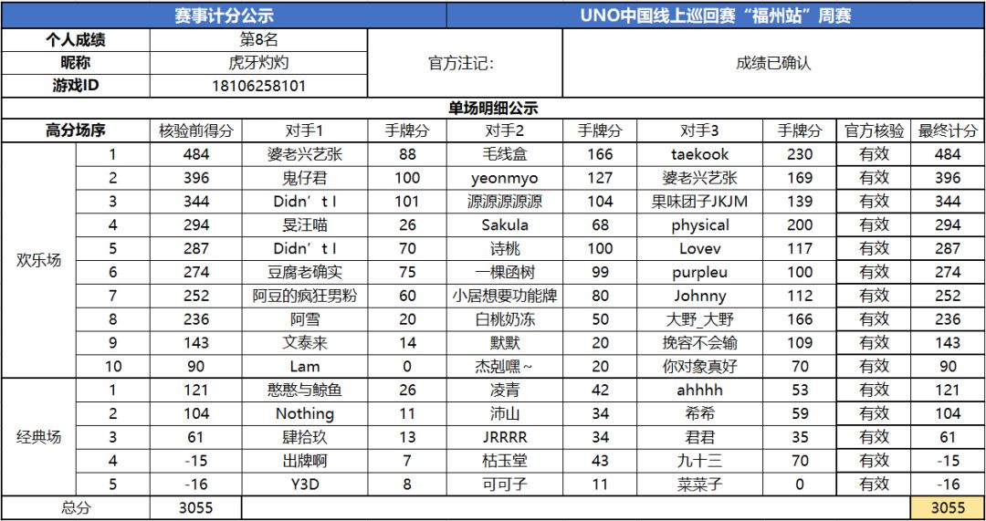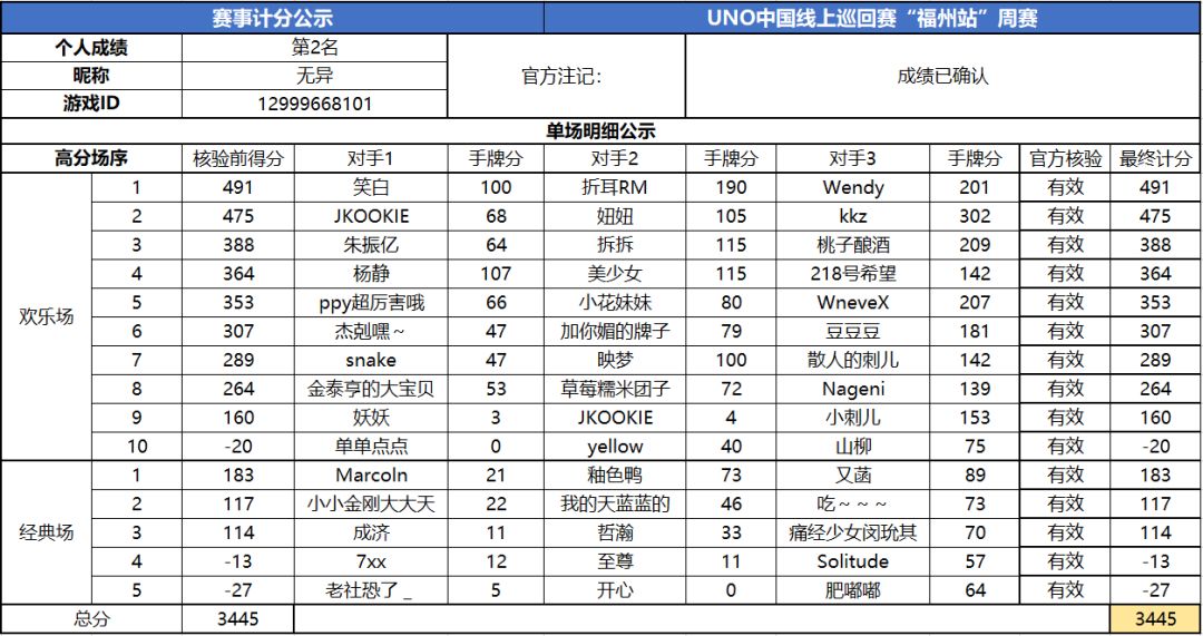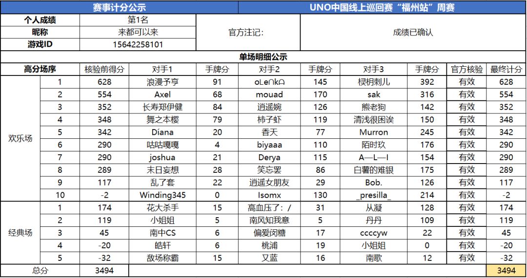 不知道是哪里出了问题,本周高分玩家的分数集体暴跌,直接掉到了3500分。不知道是不是因为本次周赛只有一星级,有些吸引力不足呢;还是说我们实力顶尖的玩家里有相当一部分是初中生,正在参加各地的中考?无论如何,本次周赛想要拿到名次相对往常可是容易了许多哦,不知道各位成绩如何呢? 本次周赛的第一名是来自四川的“来都可以来”,凭借浓缩就是精华的3494分拿到本次周赛冠军。这个id也充分展现了四川人好客的一面——来,都可以来!四川的美食还是让人难以忘怀啊,疫情缓和以后期待能再去吃兔头和甜水面呀~ 第二名和第三名分别是重庆的“无异”和北京的“从云”,二人以3445分和3337分名列二三名。如果小编没有记错的话,这是巡回赛开赛以来首次有北京玩家在周赛中闯入前三名,在此之前还只有一人在预赛中获得第三。希望全国各地的玩家们都能再接再厉,重新让我们巡回赛的周赛分数回归4000哦~ 以上就是2020UNO线上巡回赛“香港杯”周赛的战报内容啦,为了保证我们巡回赛的公平公正,根据规则,至少完成10场欢乐场及5场经典场的玩家才会判定完成本站巡回赛,而利用多开或其他违规操作的选手我们也会取消本次巡回赛成绩。 接下来对本次比赛前8名选手的个人成绩以及对局详情进行公示:
