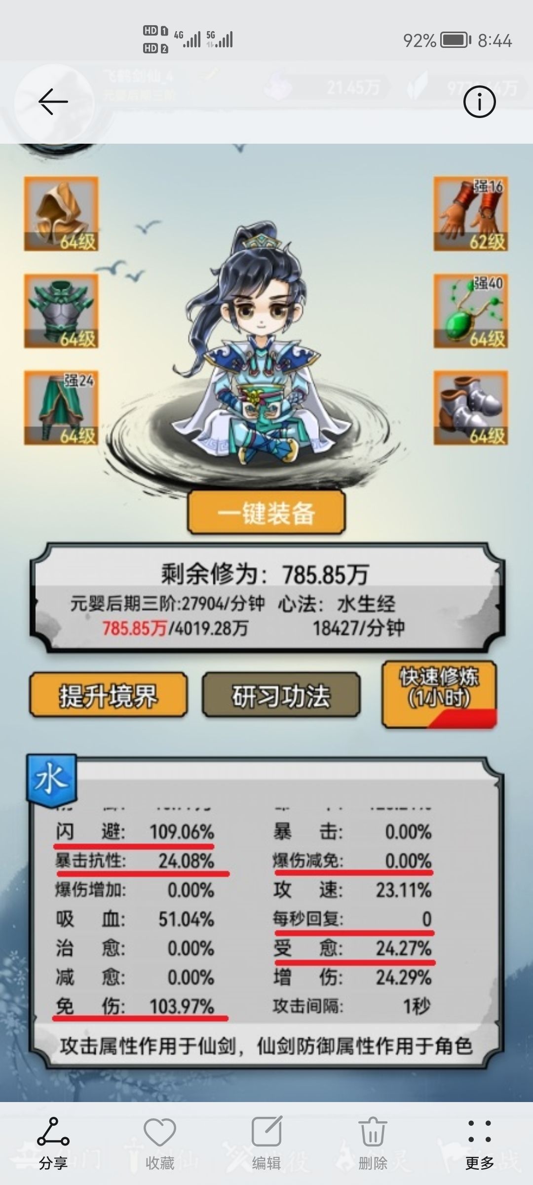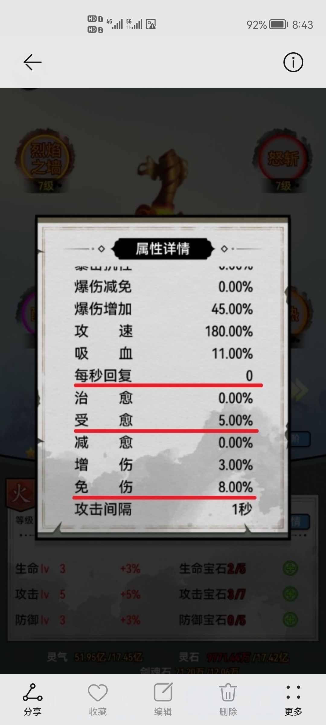 如图所示,我对人物面板和剑灵详情面板的所有防御属性进行了标记。当我们要判断自己人物的最终承伤能力水平时,就是把自己上阵的五把剑灵中的所有防御词条,加上人物面板中所显示的防御词条值,就是你最终战斗中的人物承伤水平。以示例图中的免伤为例,人物面板免伤值为103.97%,烈焰剑灵详情中免伤值为8%,那么在战斗中只上阵一把烈焰的情况下,人物最终的免伤值为111.97%,其他属性同理。