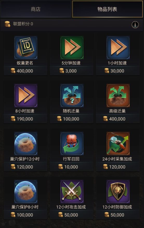 联盟商店中的商品需要由联盟管理层先从联盟商店的“物品列表”购买,购买成功后的物品将增加在商店内,供联盟成员消耗联盟贡献进行兑换。