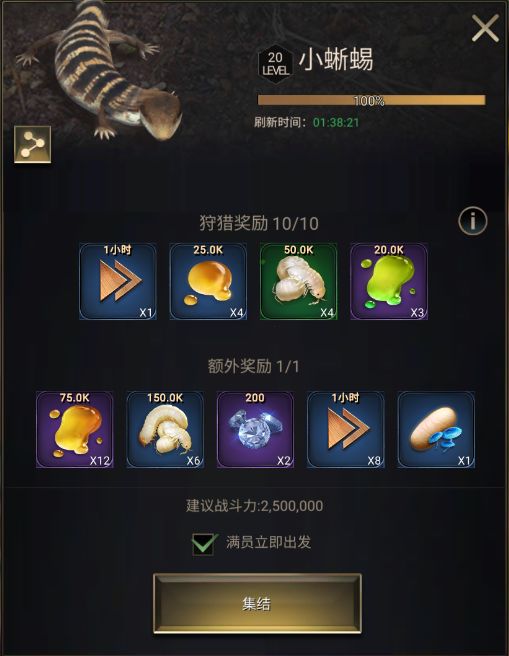 加入联盟后,可以集结盟友狩猎小蜥蜴,打败小蜥蜴可获得丰厚的狩猎奖励和额外奖励,内含大量蜜露、肉、钻石及时间加速道具等,是不可错过的福利活动~