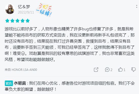 许多将军感受到了我们的用心,留下了新版本最真实的评价,这些陪伴的足迹是我们项目组无比珍视的财富,鼓励着我们一步步向前。特此我们挑选了一些新版本的优质评价,展现在本帖,并给予:元宝*888,嗜血狼珠*3