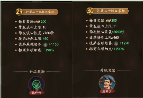 身份等级是大掌柜游戏的核心构成之一,游戏的很多构成内容(如后期提升赚速最重要的庄园系统)需要身份等级达到一定数值后才会开启,而升级身份等级可以获得包括且不限于元宝奖励,门客,珍兽等奖励,并将会提升挚友谈心上限,加速谈心恢复时间,提高徒弟培养获得的见识等等各种基础属性。