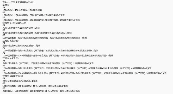 【小鲨鱼攻略组】百分之一三消卡天赋解锁材料统计