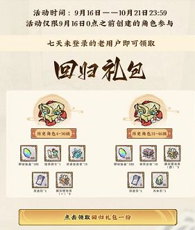 回归活动上线时间:9月21日10:00-10月21日23:59:59