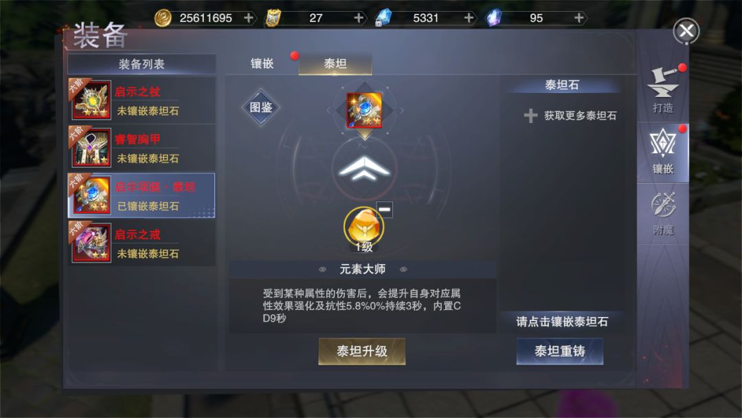 相比于普通宝石,泰坦石的稀有程度非常高!如果把泰坦石镶嵌在装备上,可以让装备获得强大的泰坦技能。例如元素大师泰坦石,受到伤害后,可以提升自身对应属性强化及抗性的加成。