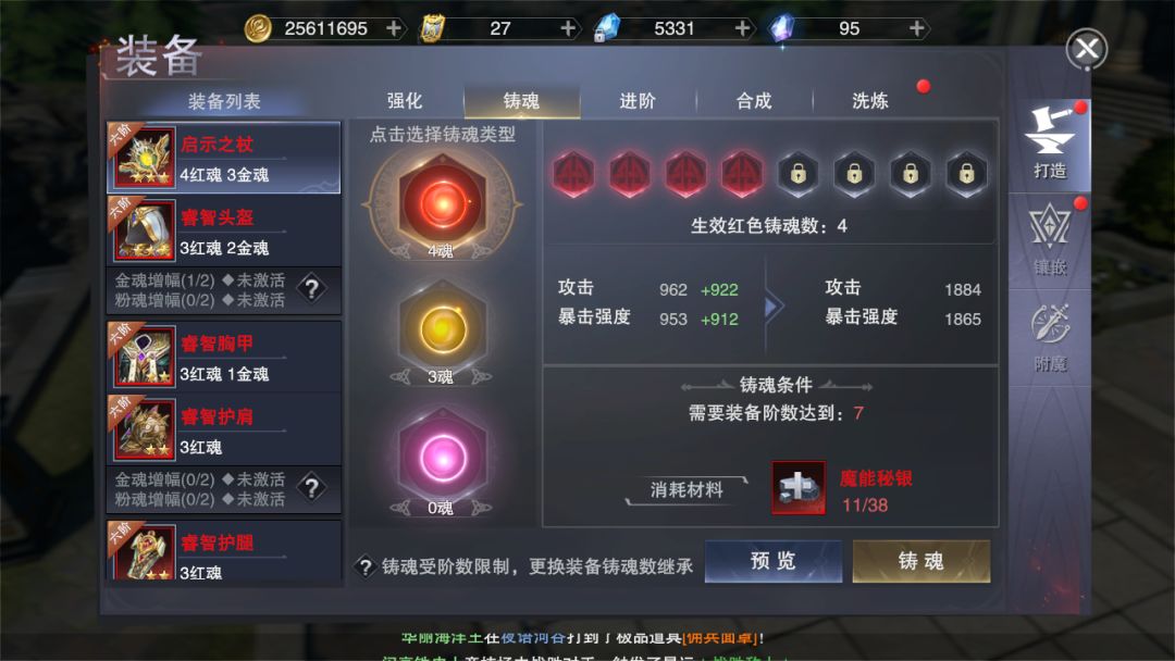 2.装备铸魂:铸魂可以增幅装备属性,除了增强普通属性,铸魂还可以激活套装属性。