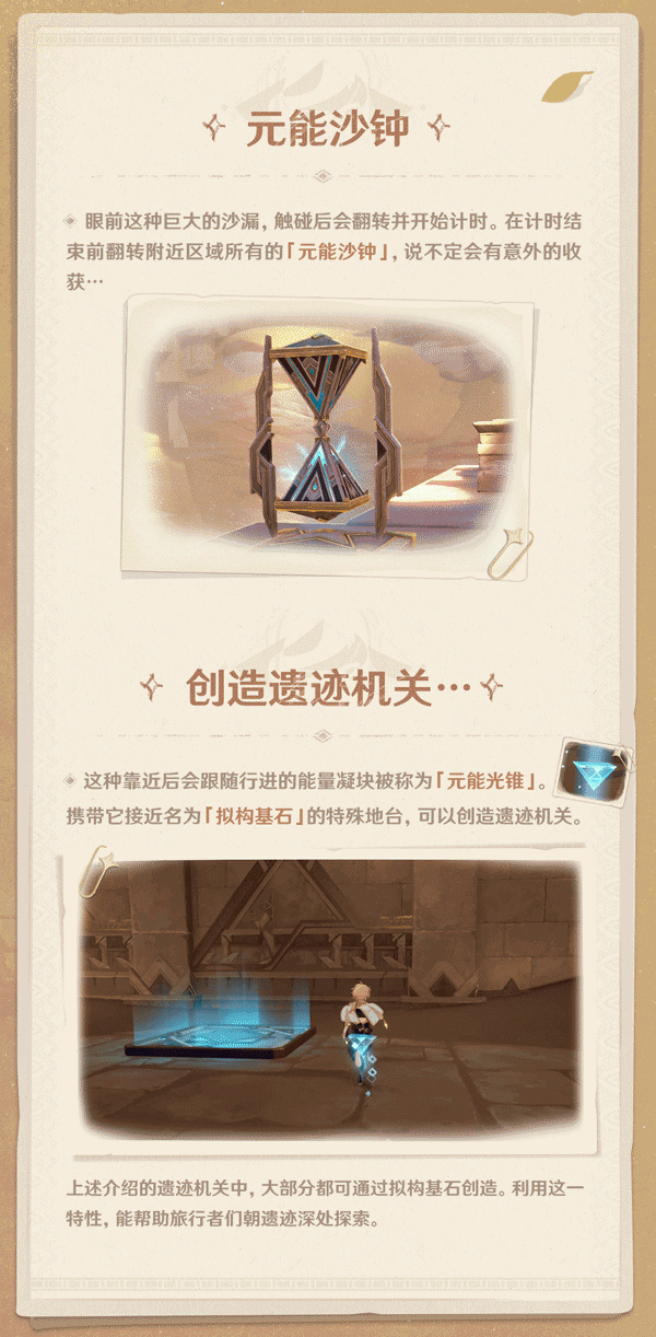 旅行者们好呀,行走在沙海之中,偶尔会发现沉睡其中的神秘遗迹。在遗迹内又会有什么样的特殊机关呢?让我们来了解一下吧~