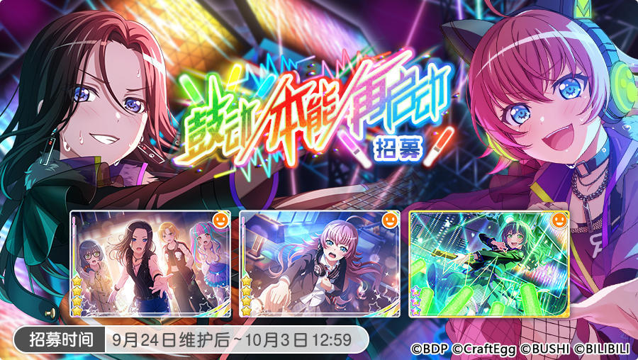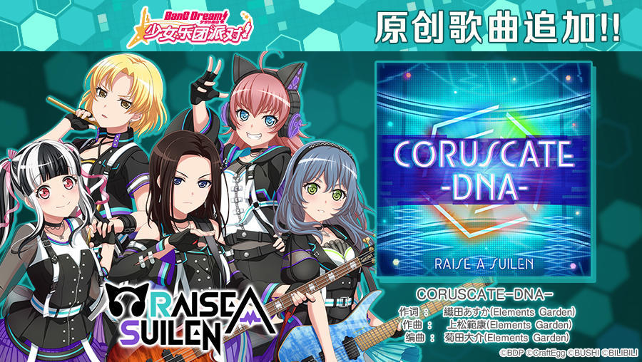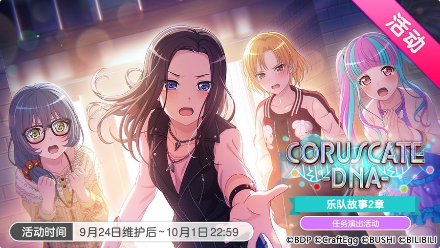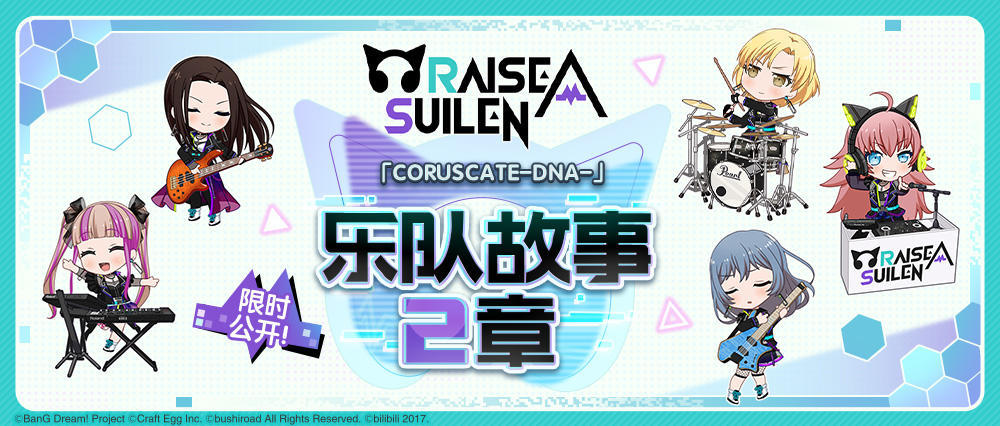 9月24日维护后,围绕RAISE A SUILEN 乐队2章,游戏内将开启「CORUSCATE-DNA-」任务演出活动和「鼓动/本能/再启动招募」,5位RAISE A SUILEN 成员将作为活动报酬及招募新增成员登场!RAISE A SUILEN 乐队故事2章「CORUSCATE-DNA-」将作为活动剧情先行公开,阅读「第15话」后可解锁RAISE A SUILEN 原创歌曲《CORUSCATE-DNA-》及该曲MV♪!