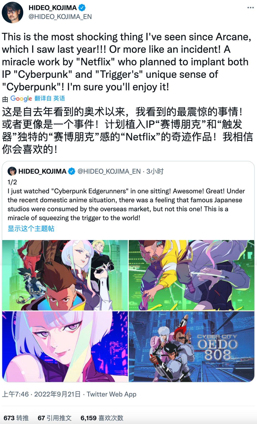“是自去年《双城之战》以来最震撼的作品!网飞将赛博朋克和扳机社风格完美融合的奇迹之作!力荐!”