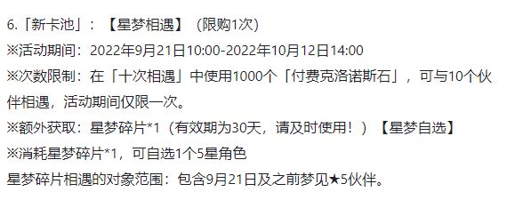 ♦️自选机制-该卡池是顺应外服节点所更新,售价为1000付费,抽取过程为:先用1000付费【或大月卡的星天劵】进行一次无保底的随机十连抽取,抽取后可以获得星梦碎片x1,使用该碎片可以在官方指定版本的卡池内自选需要的角色1名;【根据当前官方公告↓↓↓:范围是截止到伊斯卡ES为止】