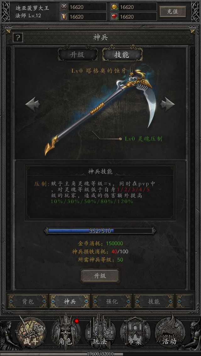 3. 神兵技能“灵魂压制”满级效果(技能效果将在10月实装):赋予主角灵魂等级(灵魂等级=技能等级),在pvp中,对灵魂等级低于自身的玩家,造成的伤害额外提高,灵魂等级差值越大,伤害提高效果越强4. 本神兵的升级材料可在市集进行兑换